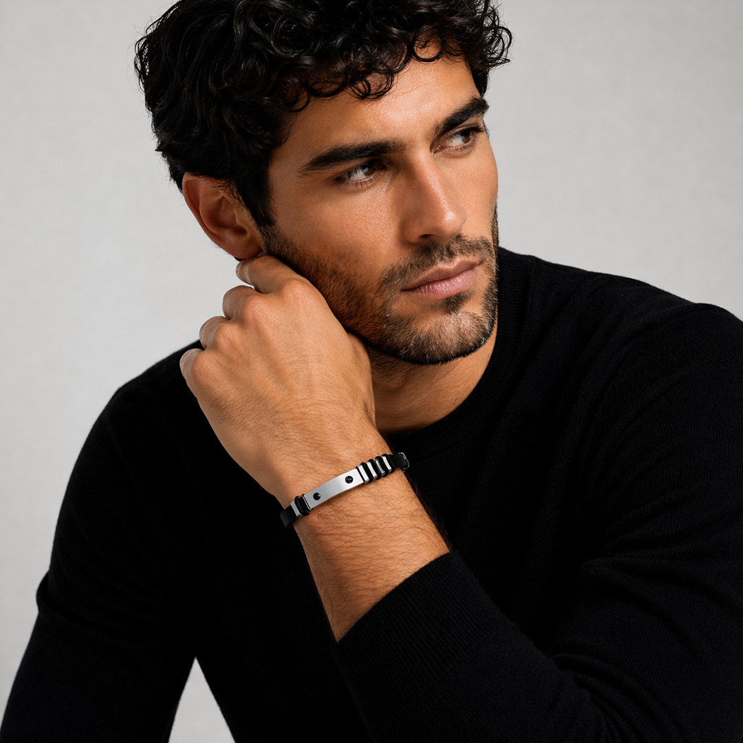 Il bracciale acciaio e caucciù uomo è pensato per chi cerca un accessorio resistente e di carattere. Le maglie in acciaio si alternano agli inserti in caucciù per un look tecnico e confortevole al polso, mentre la piastrina centrale in acciaio è pronta per la tua incisione personalizzata: puoi incidere nomi, iniziali, date, coordinate, simboli o una breve dedica.